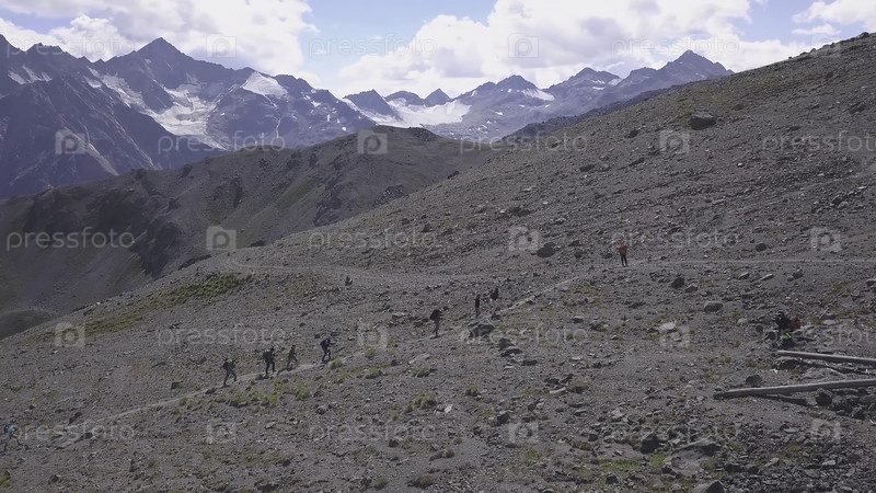 Вид сверху группы туристов, отдыхающих на горном маршруте. Клип. Горняки выстраиваются вдоль скалистой горной тропы на фоне заснеженных гор. Потрясающий горный путь