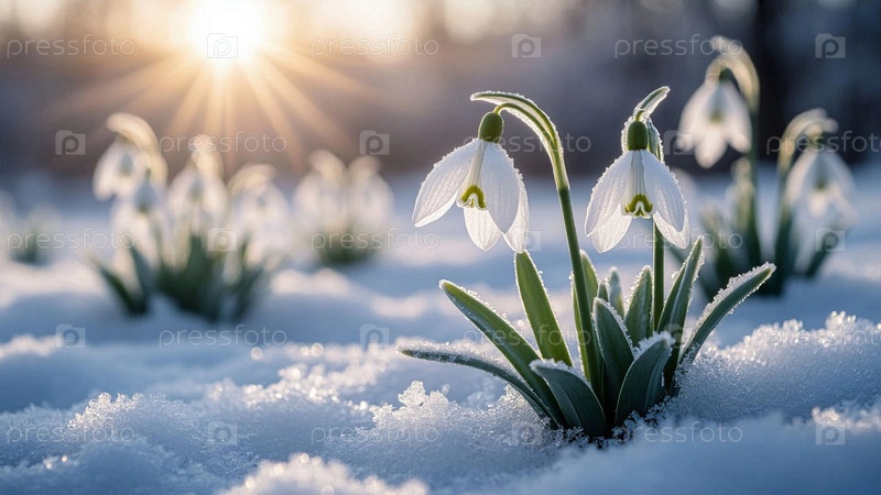Цветы снежинки в лесу, солнечный свет. Первые красивые снежинки весной. Цветение обычной снежинки. Снежная пролеска (Galanthus nivalis) цветет в весеннем лесу. Снежинки крупным планом