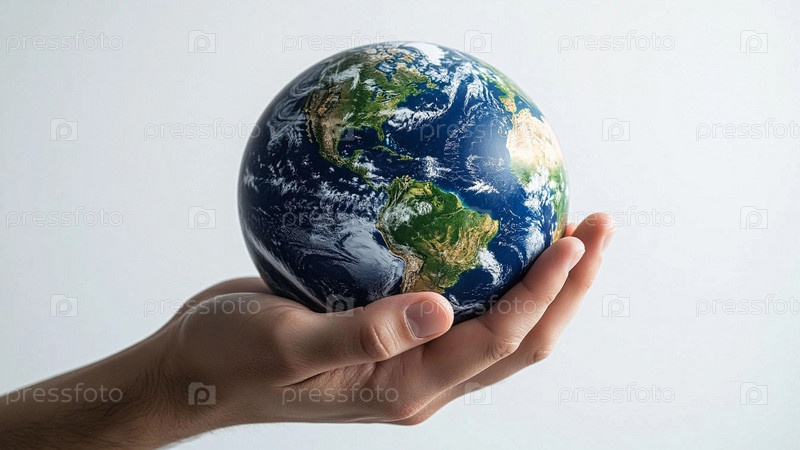 Рука держит макет планеты Земля на однотонном фоне. Планета в руках