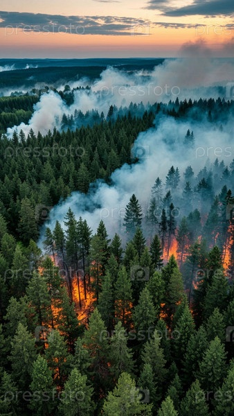 Лесной пожар. Лес в огне, горят деревья, дым
