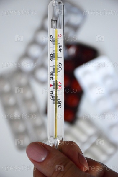 Термометр в руке женщины с повышенной температурой на фоне таблеток и лекарств