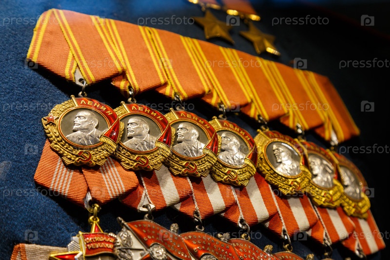 Москва, Россия - 23 января 2019: Центральный музей вооруженных сил. Различные награды, ордена и медали на форме российской армии. Память о наградах и медалях Второй мировой войны и Великой Отечественной войны