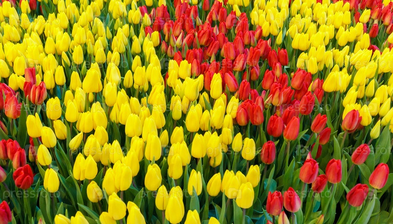 Красочное поле тюльпанов на заднем плане. Прекрасный весенний пейзаж. Цветение цветов