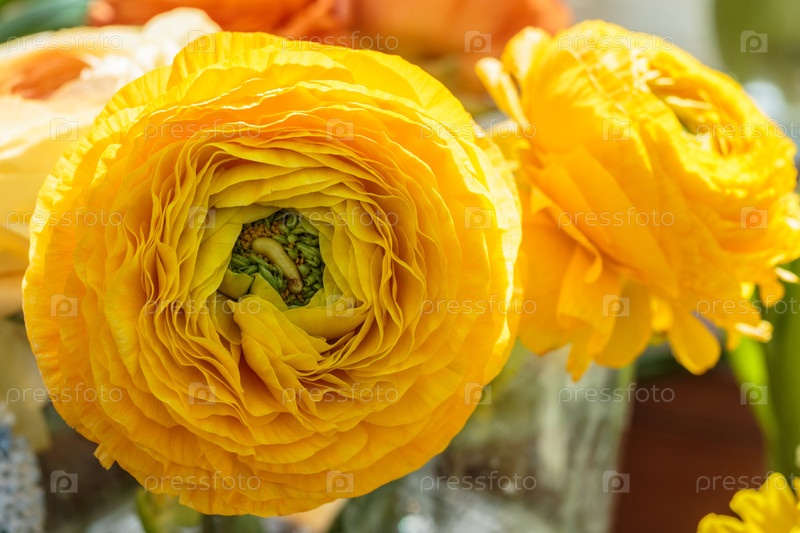 Красивый желтый травянистый пион. ближайший взгляд на Ranunculus aka buttercup цветок, изысканный, с розовыми цветами. персидский Buttercup