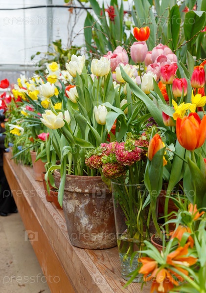 Цветы в зеленой комнате. цветочный букет магазин. цветящие растения и многоцветные цветы внутри садового центра