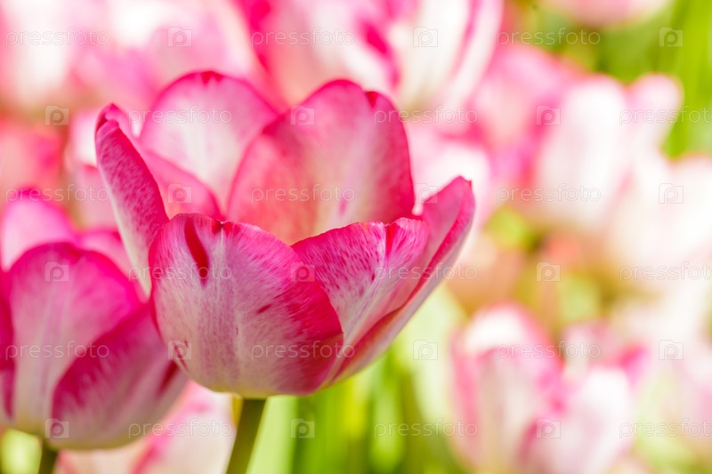 Ближайшее изображение красивых тюльпанов. Весенние цветы на фоне цветения. Свежие растения в саду. Поле тюльпанов