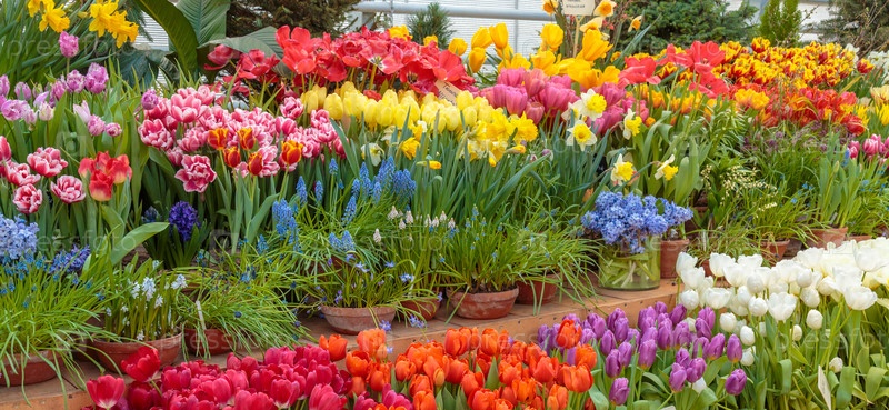 Цветы в зеленой комнате. цветочный букет магазин. цветящие растения и многоцветные цветы внутри садового центра