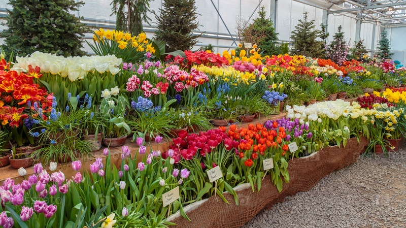 Цветы в зеленой комнате. цветочный букет магазин. цветящие растения и многоцветные цветы внутри садового центра