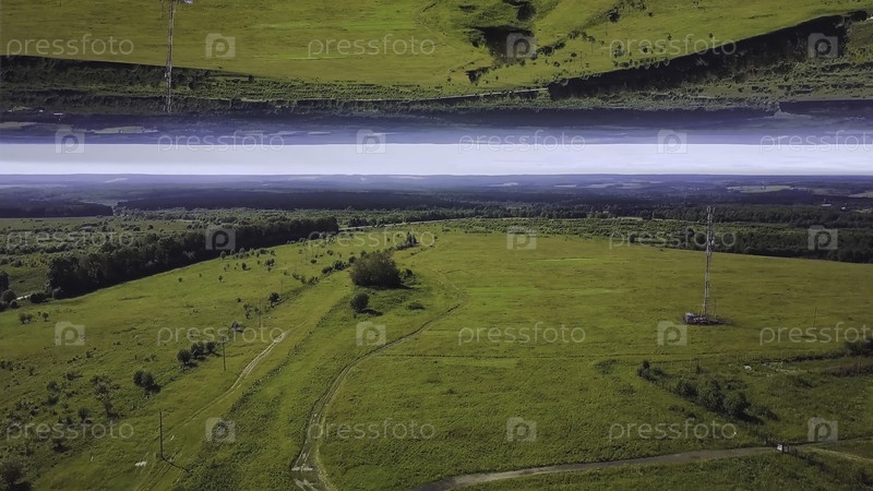 Вид с воздуха на красивую зеленую лугу с деревьями и кустарниками в солнечный летний день, эффект зеркального горизонта. потрясающий пейзаж зеленого поля и леса, тема инсепции
