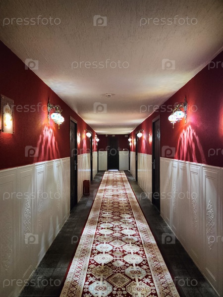 Винтажный гостиничный коридор с красной ковровой дорожкой, орнаментированным освещением и рисунковым бегуном, классическим фоном интерьера, элегантными обоями для прихожей