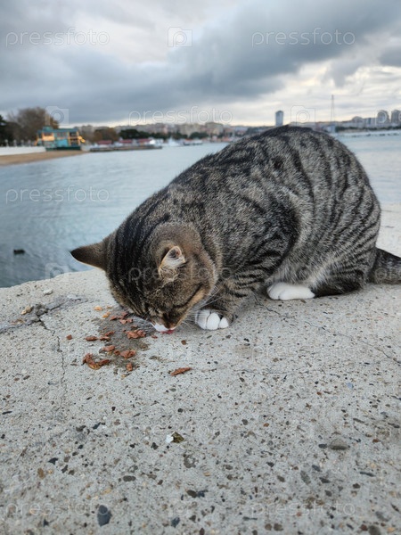 Табби-кошка на пирсе у моря с облачным небом, прибрежным животным фоном, обои для морских кошек