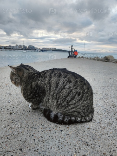 Табби-кошка на пирсе у моря с облачным небом, прибрежным животным фоном, обои для морских кошек