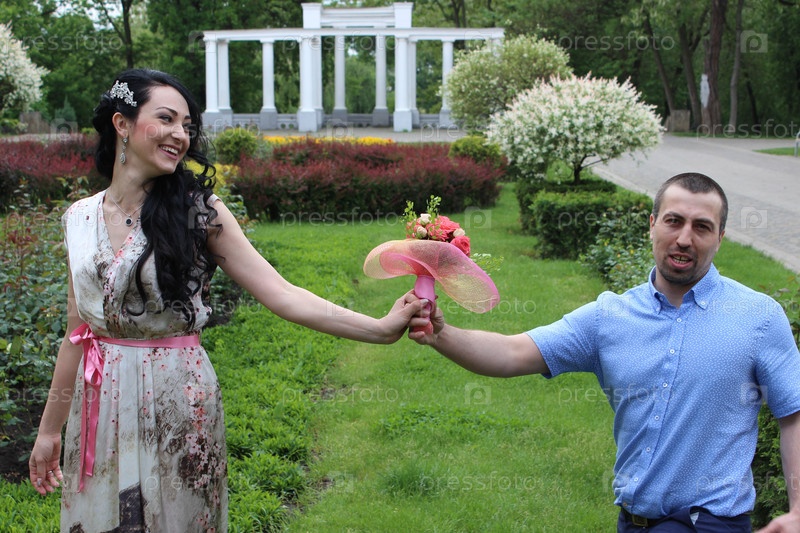 Молодожены без белого платья, фаты и черного костюма стоят на клумбе и держат букет цветов