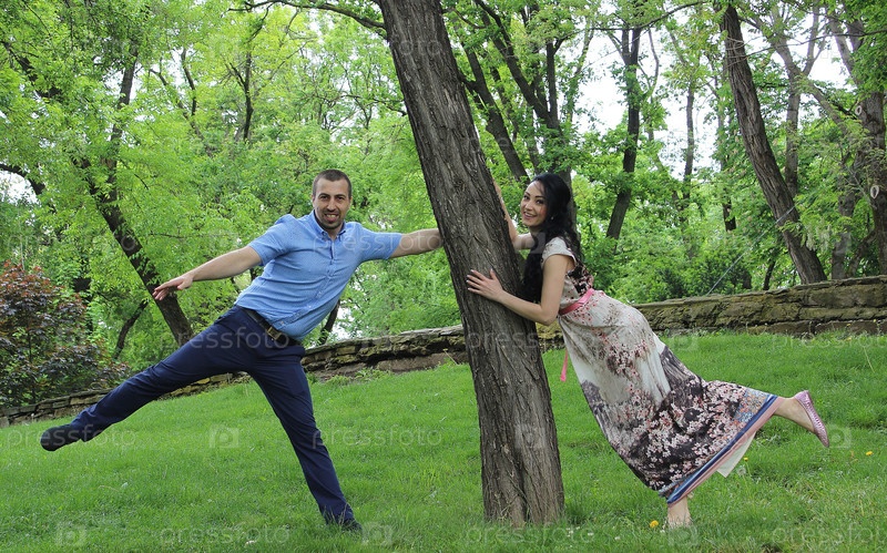 Молодожены дурачатся возле дерева в парке, отставив ноги
