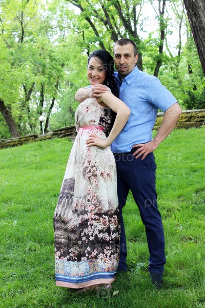 Молодой муж обнимает сзади молодую жену в парке весной