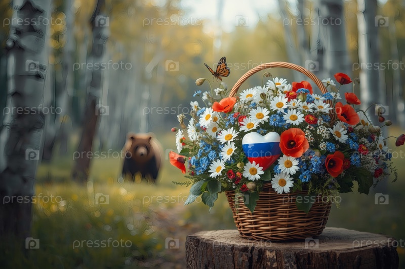 Концепция празднования Дня России - красивый, легкий и воздушный букет белых ромашек, красных маков и голубых кукурузных цветов в плетеновой корзине на стебле березового леса с медведем на заднем плане