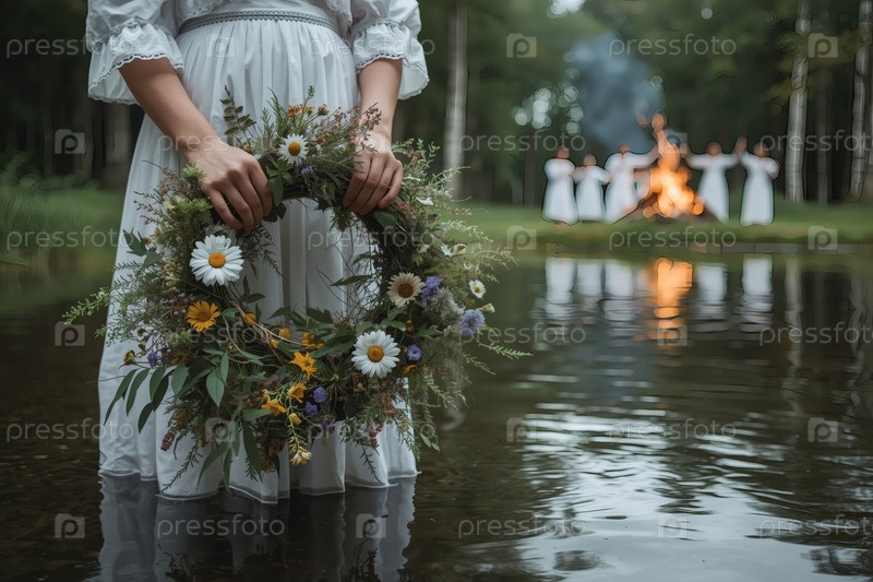 Красивый летний венок из диких цветов в руках девушки, стоящей на воде. русский народный праздник Иван Купала. обычаи и традиции