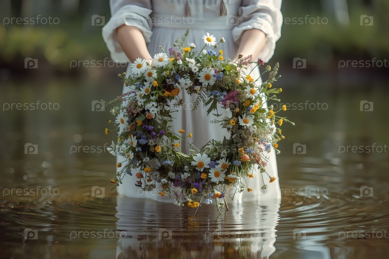 Красивый летний венок из диких цветов в руках девушки, стоящей на воде. русский народный праздник Иван Купала. обычаи и традиции