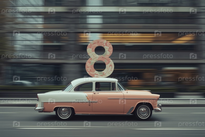 Концепция праздника, посвященного Международному женскому дню 8 марта.Розовый ретро-автомобиль с восьмигранной композицией на крыше, движущийся по городской улице в окружении небоскребов