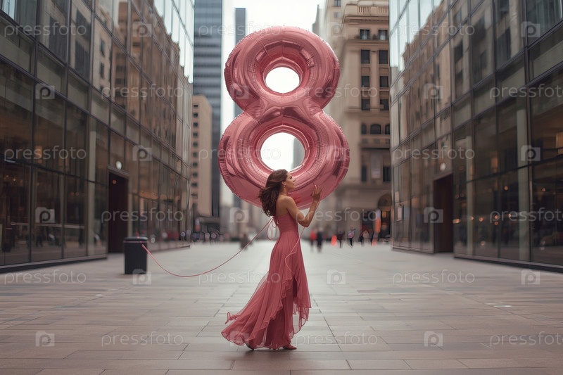 Концепция праздника, посвященного Международному женскому дню 8 марта.Женщина в розовом платье держит огромный шар в форме восьмерки на улице города, окруженной небоскребами