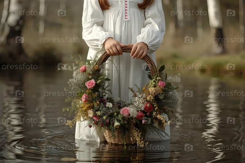 Красивый летний венок из диких цветов в руках девушки, стоящей на воде. русский народный праздник Иван Купала. обычаи и традиции