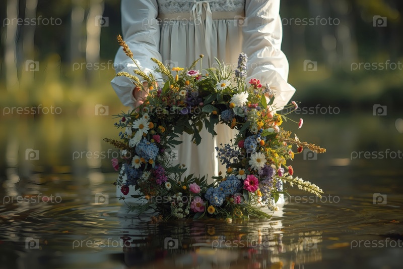 Красивый летний венок из диких цветов в руках девушки, стоящей на воде. русский народный праздник Иван Купала. обычаи и традиции