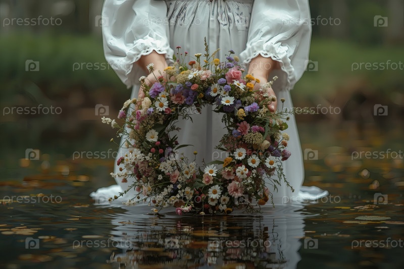 Красивый летний венок из диких цветов в руках девушки, стоящей на воде. русский народный праздник Иван Купала. обычаи и традиции