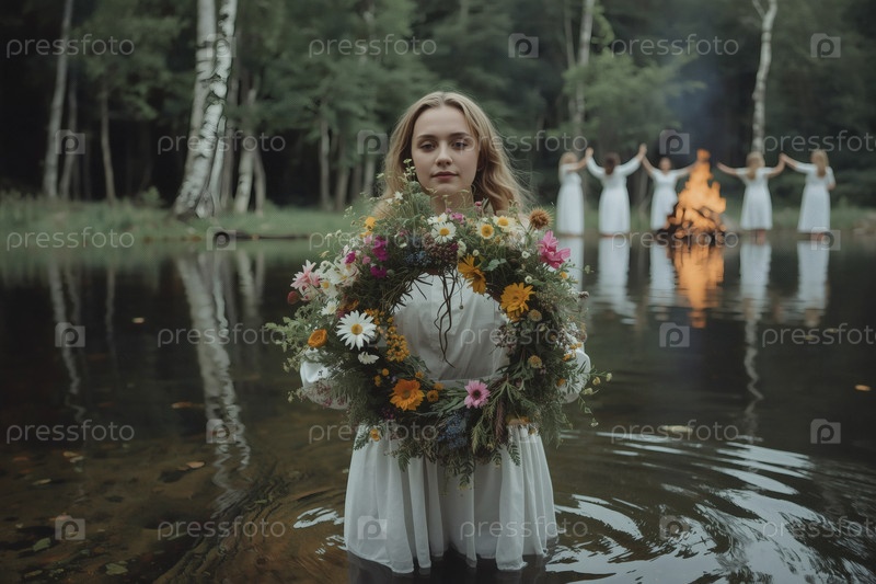 Красивый летний венок из диких цветов в руках девушки, стоящей на воде. русский народный праздник Иван Купала. обычаи и традиции