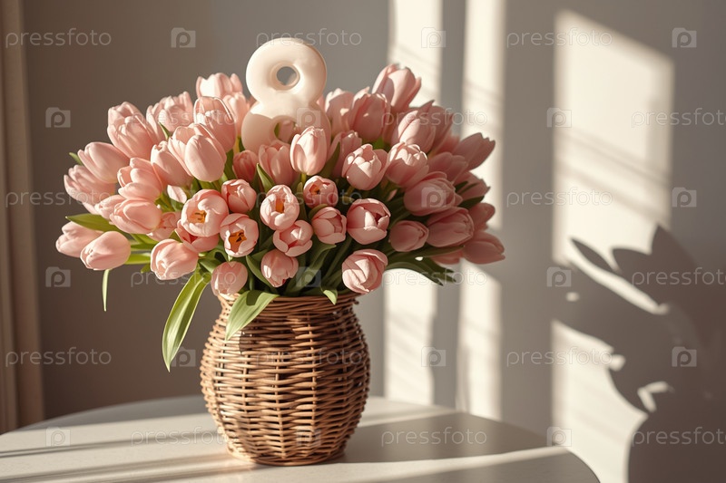 Концепция праздника Международного женского дня 8 марта: букет розовых тюльпанов в плетеновой корзине на белом столе у окна