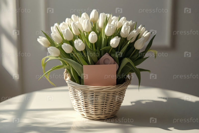 Концепция праздника Международного женского дня 8 марта: букет белых тюльпанов в плетеновой корзине на белом столе у окна