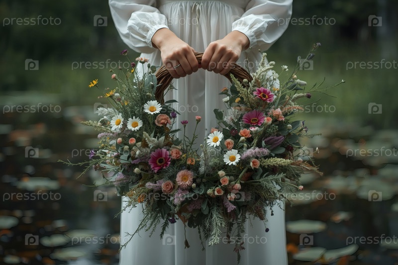 Красивый летний венок из диких цветов в руках девушки, стоящей на воде. русский народный праздник Иван Купала. обычаи и традиции