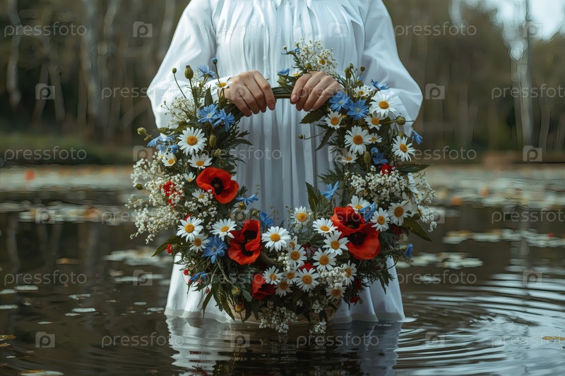 Красивый летний венок из диких цветов в руках девушки, стоящей на воде. русский народный праздник Иван Купала. обычаи и традиции