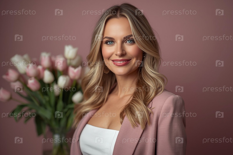 Концепция праздника Международного женского дня 8 марта.Молодая женщина в розовом куртке держит букет белых и розовых тюльпанов на розовом фоне