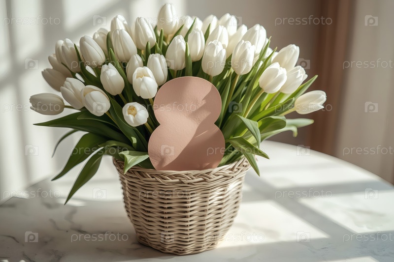 Концепция праздника Международного женского дня 8 марта: букет белых тюльпанов в плетеновой корзине на белом столе у окна