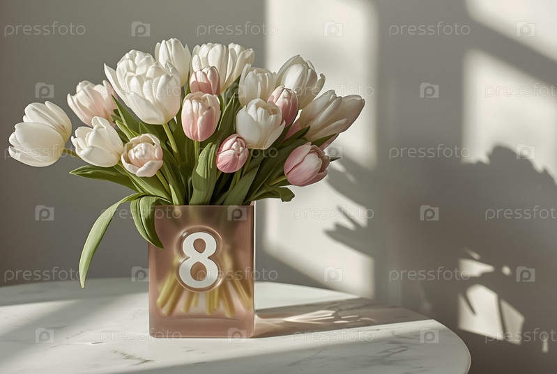 Концепция Международного женского дня 8 марта. букет белых и розовых тюльпанов в квадратной стеклянной вазе на белом столе у окна