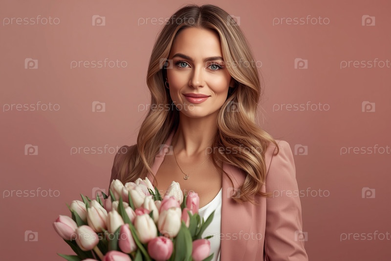 Концепция праздника Международного женского дня 8 марта.Молодая женщина в розовом куртке держит букет белых и розовых тюльпанов на розовом фоне