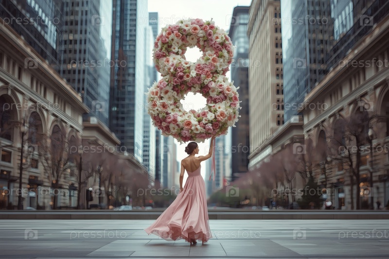 Концепция праздника, посвященного Международному женскому дню 8 марта.Женщина в розовом платье держит огромную цветочную восьмерку на городской улице, окруженной небоскребами