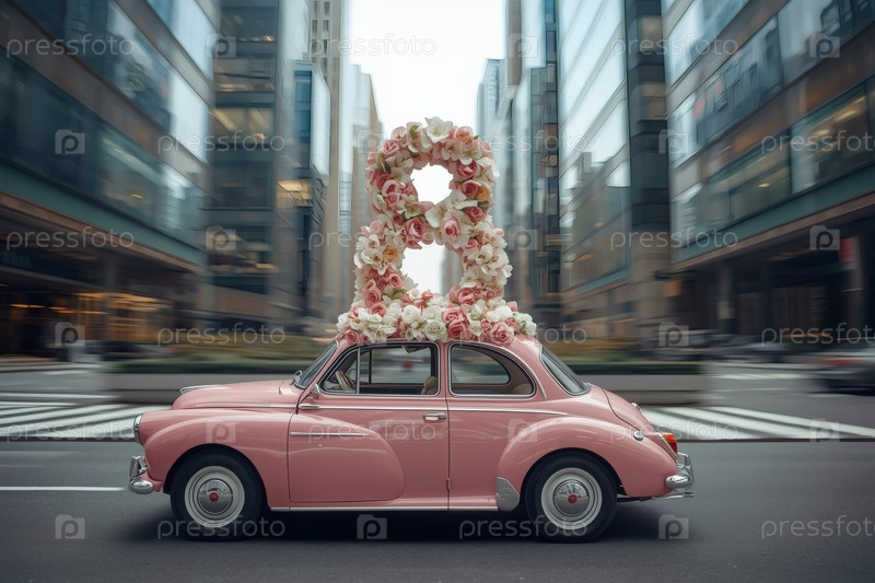 Концепция праздника Международного женского дня 8 марта.Розовый ретро-автомобиль с цветной аранжировкой в форме восьмерки на крыше, движущийся по улице города среди небоскребов