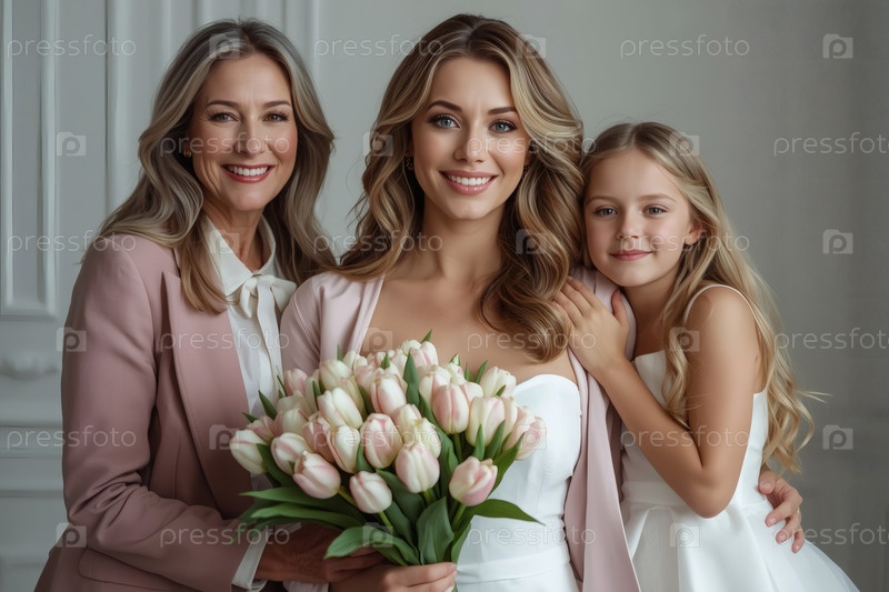 Концепция праздника, посвященного Международному женскому дню 8 марта.Три поколения женщин.Молодая женщина, несущая букет тюльпанов, в сопровождении пожилой матери и маленькой дочери