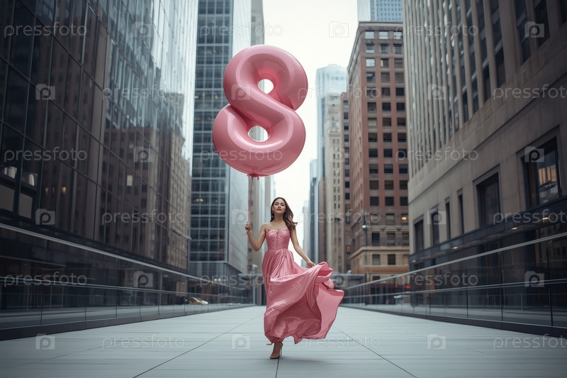 Концепция праздника, посвященного Международному женскому дню 8 марта.Женщина в розовом платье держит огромный шар в форме восьмерки на улице города, окруженной небоскребами