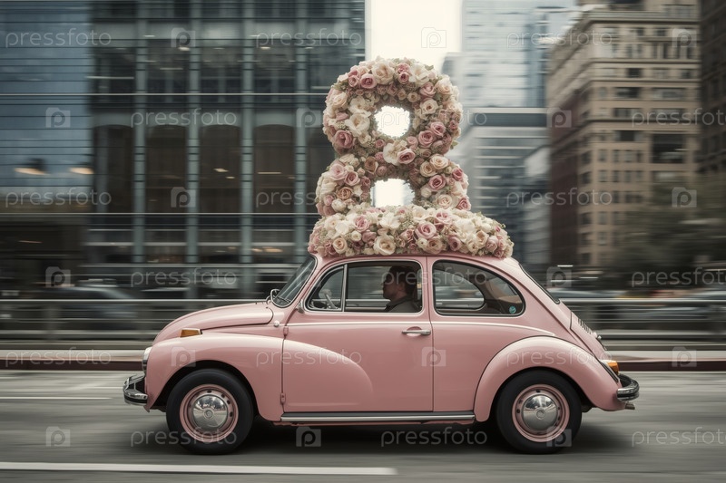 Концепция праздника Международного женского дня 8 марта.Розовый ретро-автомобиль с цветной аранжировкой в форме восьмерки на крыше, движущийся по улице города среди небоскребов