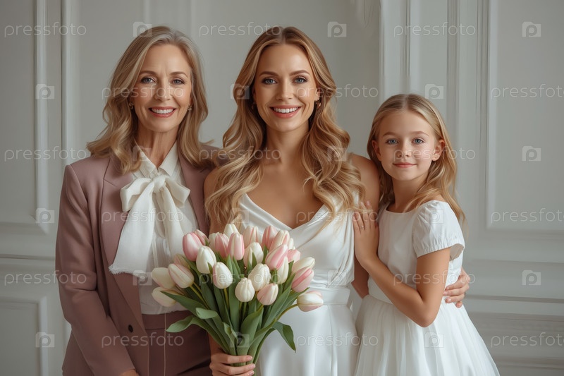 Концепция праздника, посвященного Международному женскому дню 8 марта.Три поколения женщин.Молодая женщина, несущая букет тюльпанов, в сопровождении пожилой матери и маленькой дочери