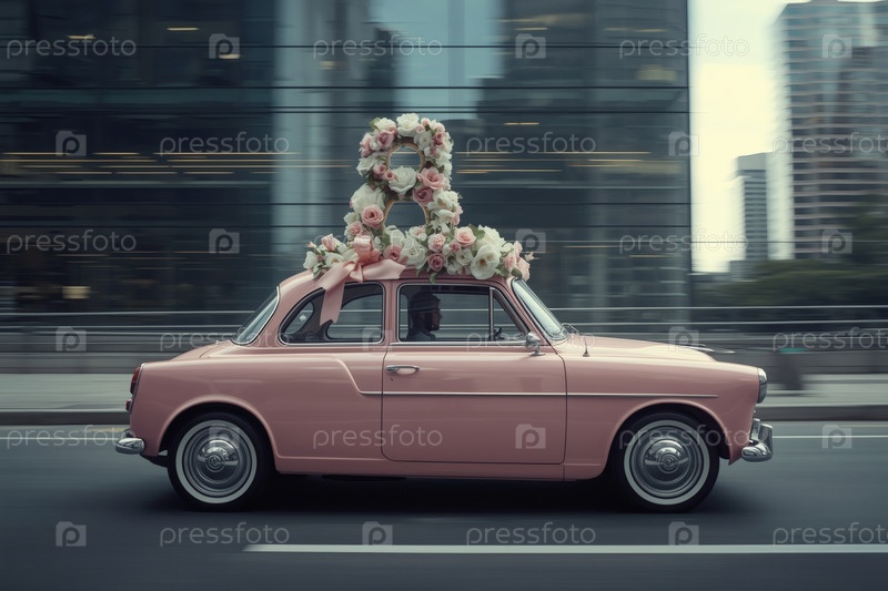 Концепция праздника Международного женского дня 8 марта.Розовый ретро-автомобиль с цветной аранжировкой в форме восьмерки на крыше, движущийся по улице города среди небоскребов