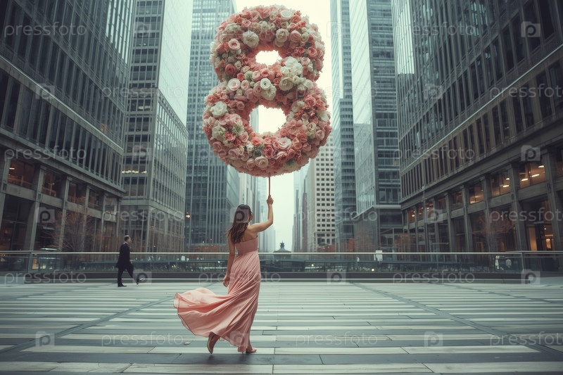 Концепция праздника, посвященного Международному женскому дню 8 марта.Женщина в розовом платье держит огромную цветочную восьмерку на городской улице, окруженной небоскребами