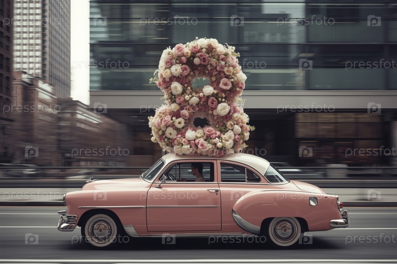 Концепция праздника Международного женского дня 8 марта.Розовый ретро-автомобиль с цветной аранжировкой в форме восьмерки на крыше, движущийся по улице города среди небоскребов