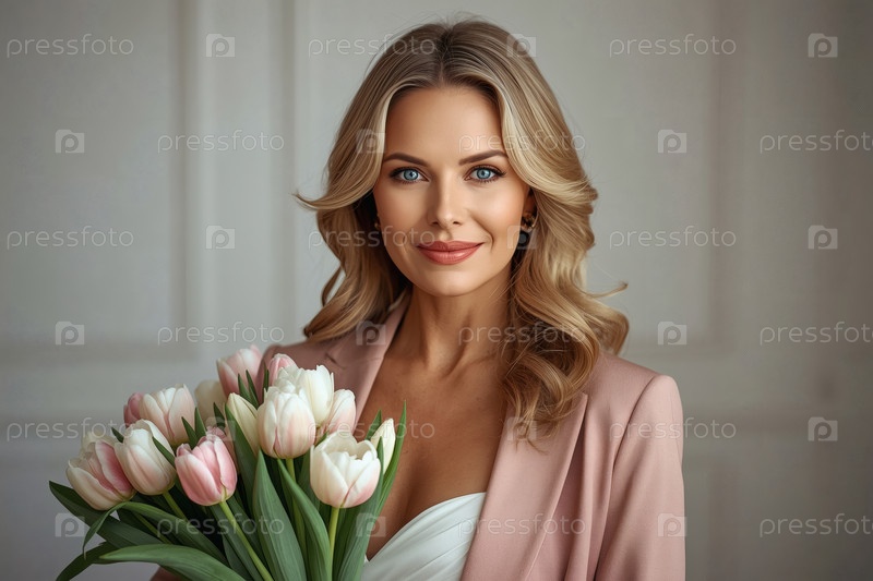 Концепция праздника, посвященного Международному женскому дню 8 марта.Молодая женщина в розовом куртке держит букет белых и розовых тюльпанов в ярком интерьере
