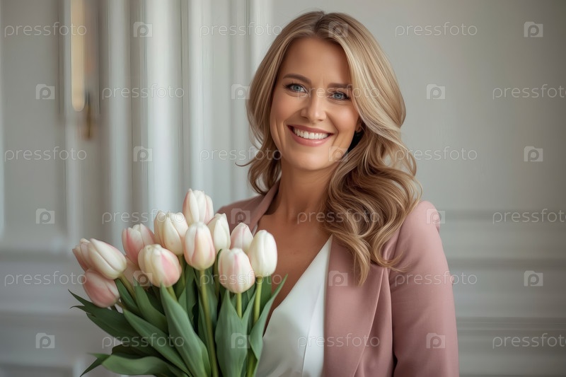 Концепция праздника, посвященного Международному женскому дню 8 марта.Молодая женщина в розовом куртке держит букет белых и розовых тюльпанов в ярком интерьере