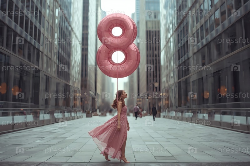 Концепция праздника, посвященного Международному женскому дню 8 марта.Женщина в розовом платье держит огромный шар в форме восьмерки на улице города, окруженной небоскребами