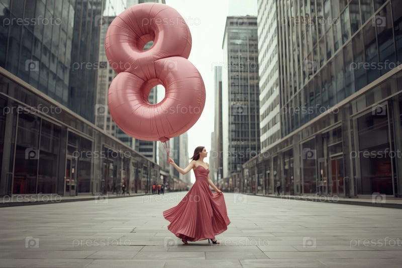 Концепция праздника, посвященного Международному женскому дню 8 марта.Женщина в розовом платье держит огромный шар в форме восьмерки на улице города, окруженной небоскребами