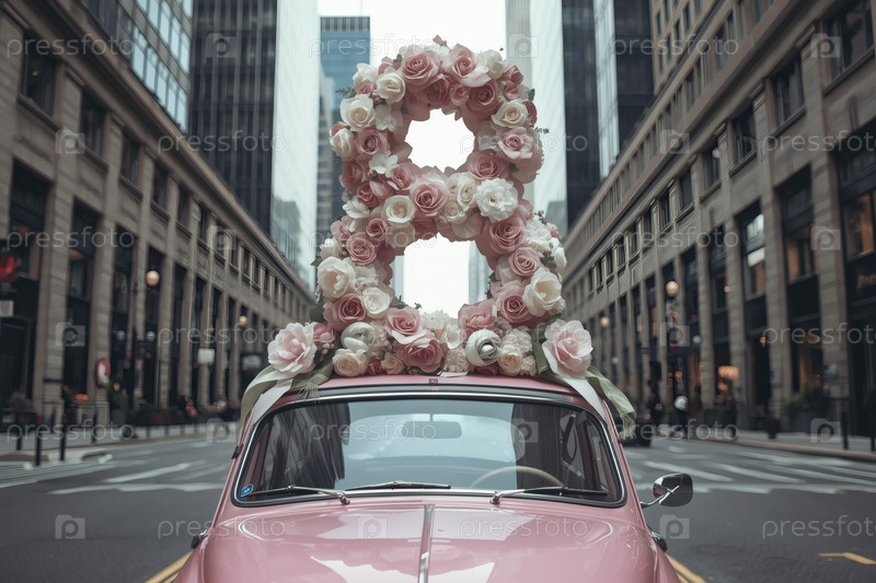 Концепция праздника Международного женского дня 8 марта.Розовый ретро-автомобиль с цветной аранжировкой в форме восьмерки на крыше, движущийся по улице города среди небоскребов